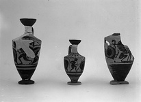 Description:   Mouth missing, otherwise complete. Scene depicts youth between eyes. The youth appears to be holding a flexible wand (leafless vine branch?); another sprouts from in front of his foot. Hasty work. Picture set to left of center with reference to handle; a few careless lines incised on the youth; the white(?) circle to be traced on the right eye mostly destroyed at the left edge through faulty firing.