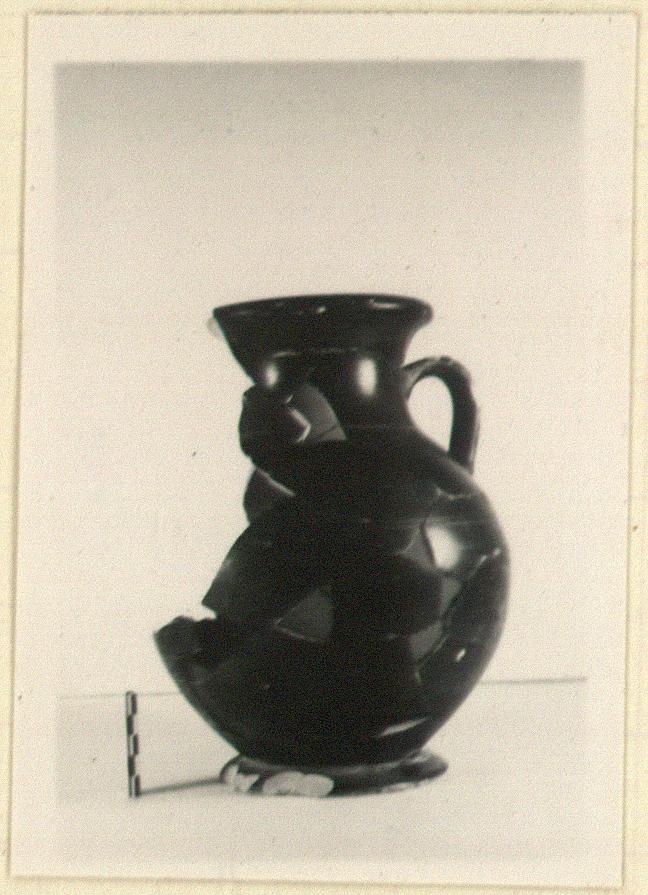 | Description: | Much of wall missing, as well as part of lip and one handle and chips from the foot. Low echinus foot; plump body, concave neck set off from shoulder by light ridge; thickened flaring lip. Short band handles, neck to shoulder. Underside of foot and interior below lip unglazed. Firm black glaze in part fired red. A purple line at base of neck and two pairs of lines on the shoulder. | |