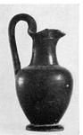 | Description: | Handle missing (restored) and small chips from lip; otherwise intact. Spreading foot, slender egg-shaped body; tall neck set off from trefoil lip by a light ridge. Band of tongues, alternating black and purple, below neck; double band of purple on body just below shoulder, and single one just above foot. Two rivet holes at lower handle attachment, show an ancient break. Rather dull black glaze except under foot. | |