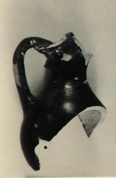 | Description: | Front of lip and parts of body missing; restored in plaster. From a small oinochoe similar to P 12816 (Ψ 294), but not ribbed. Around the neck, a wreath of long thin leaves; on the front of the body, a many-pointed star, painted in added clay. No remains of gilding. Firm, fairly good black glaze. | |