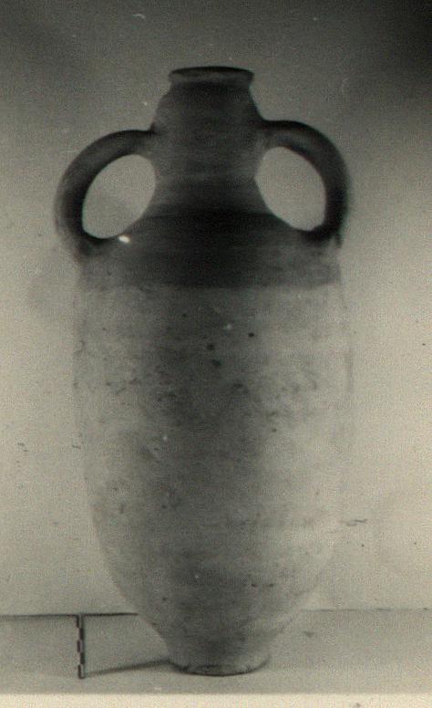 | Description: | Fragment of mouth and chips missing. Elongated egg-shaped body on low ring foot; neck bulges slightly below narrow flaring lip; thick projecting band handles, from middle of neck to shoulder. On shoulder, a black dipinto: <graphic> Light buff clay. Coarsely made. | |