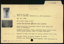 | Description: | Chips and mouth missing; hole in shoulder; otherwise intact. Long, tapering body; rounded shoulder; narrow neck; thick broad handle, from neck to upper shoulder. Several lines of black dipinti on neck: <graphic> Pinkish-buff clay. Smears of thin red wash on walls. Another Jug (no dipinti) uncatalogued, from Container 8. ADDENDA Sparta Series (JWH). | |
