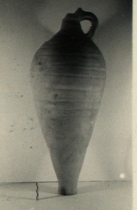 | Description: | Chips and mouth missing; hole in shoulder; otherwise intact. Long, tapering body; rounded shoulder; narrow neck; thick broad handle, from neck to upper shoulder. Several lines of black dipinti on neck: <graphic> Pinkish-buff clay. Smears of thin red wash on walls. Another Jug (no dipinti) uncatalogued, from Container 8. ADDENDA Sparta Series (JWH). | |