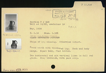 | Description: | Chips of lip missing; otherwise intact. Flat bottom; squat body; neck and body merge; round mouth with thickened lip. Two horizontal and six vertical lines in dull red glaze. Clay brownish. Pale slip. | |