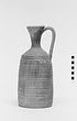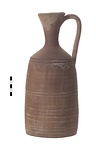| Description: | [Originally mouth, handle and most of neck missing; now added.] Half of rim missing; restored in plaster. Broad flat bottom; cylindrical body; sloping shoulder; narrow neck. Decorated with grooves: at top of body, two plain and a wavy, at middle two plain, at bottom several irregular plain. | |