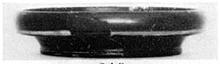 | Description: | Two small pieces of floor and chips missing. Shallow open bowl on low base ring; low concave side wall; broad keeled rim with groove at lower edge. Pinkish-buff clay. Covered with good black glaze except for reserved band on line of groove, resting surface and disk at center of bottom; the disk surrounded by a raised ring and decorated with small circle and dot. Center of floor fired red from stacking. | |