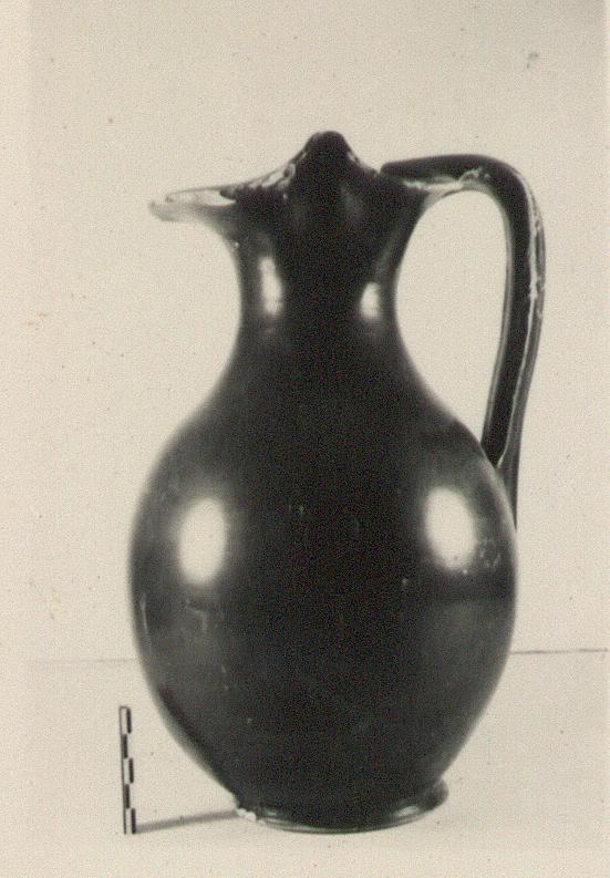 | Description: | Complete. Ring foot; tall egg-shaped body; elongated neck; exaggerated trefoil lip. Triangular handle. Good black glaze; resting surface reserved. | |