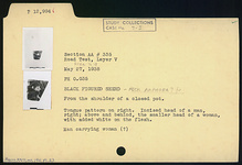 | Description: | From the shoulder of a closed pot. Tongue pattern on right. Incised head of a man, right; above and behind, the smaller head of a woman, with added white on the flesh. Man carrying a woman(?). | |