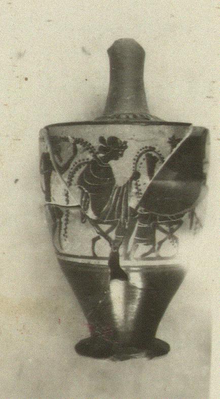 | Description: | Mended from many pieces. Missing: mouth, handle, parts of figured side including upper part of Dionysos. Scene depicts Dionysos and a woman seated between satyrs. The satyrs look center, dance right. Accessory red on beards, fillets, garment folds. A pair of red lines round top of glazed portion below the scene. On the shoulder, lotus bud border around collar of small strokes and around hollow band (colored red) at base of neck. | |