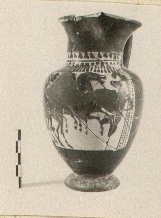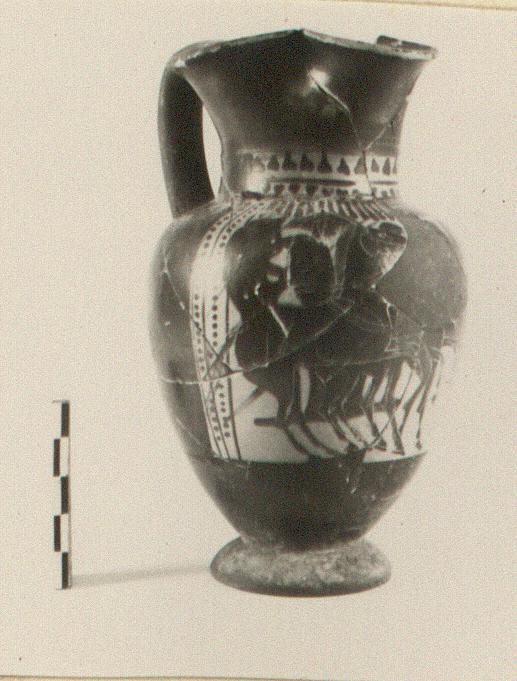 | Description: | One fragment preserves most of lower wall, except foot; the other much of neck and trefoil lip, with part of shoulder. Restored in plaster. Egg-shaped body; deep trefoil lip. Ivy band at base of neck; a light ridge and a red line above it. Figured panel bordered by tongues above; double row of dots between bands at sides; faded red(?) line, extending around wall below. Four horses, right; behind them, part of an uncertain object (chariot?). To right, facing the horses, a helmeted figure, female. Red on manes; white for Athena's face. | |