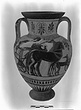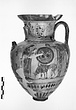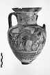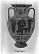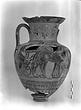 | Description: | Foot broken off; small pieces missing from body and lip; and one handle. Eggy body; narrow neck marked off above and below by light ridges; broad echinus lip; high ridged handles. Above the foot, a raised ring, red; then a narrow red band from which spring rays; then a zone of linked lotuses between double bands. Red on ridge at base of neck; below it, short tongues; palmette and lotus ornament under the handles. The handles glazed, and the lip; its top reserved, with a red line at inner and outer edge. On neck, front and back, bordered top and bottom by a single line, three palmettes. A) Quadriga right, the charioteer stepping into the chariot; behind the horses a helmeted warrior also right, looking back left; and just in front of the horses, a dog. B) A warrior, with helmet, shield and dog, standing left between two draped figures, a woman to the left and a man to the right. Considerable incision. Red and white freely used for details. | |
