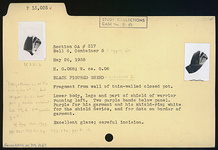 | Description: | Fragment from wall of thin-walled closed pot. Lower body, legs and part of shield of warrior running left. Two purple bands below panel. Purple for his garment and his shield-rim; white for the shield device, and for dots on border of garment. Excellent glaze; careful incision. Cf. Hesperia 8 (1939), pp. 221-223, pp. 233-234, fig. 31. | |