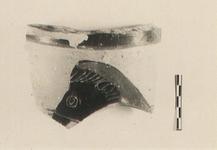 | Description: | Fragment from top of large stand, preserving part of one piercing through the wall. At the top of the fragment, black, and a narrow red band. Below, a large horse's or lion's head, left. Red mane. | |