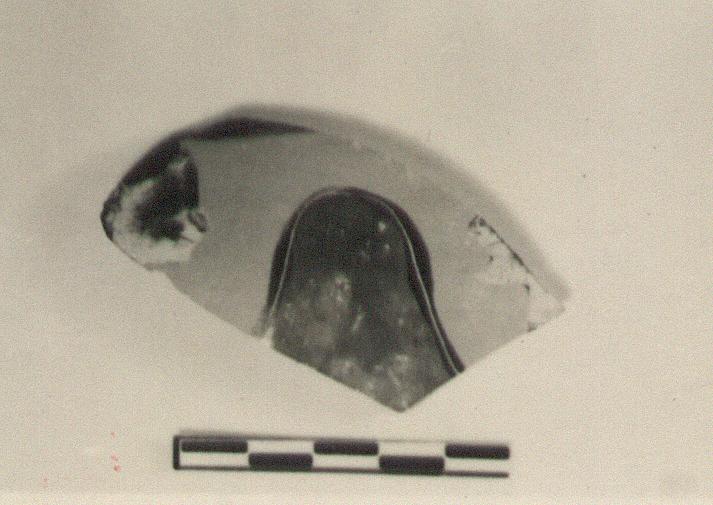 | Description: | From the upper wall of a large open pot. Depicts the heads of two sirens facing, and the top of the spread wing of one between. Black along edge above. Added white on faces, purple on wing. Firm black glaze inside. | |