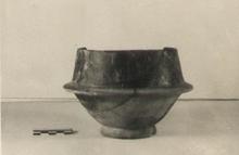 | Description: | Part of the wall and rim missing. Ring foot and convex lower body; a projecting keel where the lower body and straight inward-tilted rim meet. Poor black glaze, brownish inside, over upper part of outside and irregularly below. | |