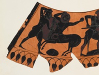 Description:   Slightly more than one-half of neck and shoulder, with one handle, of a massive bauch-amphora. Mended from many fragments. Decoration on one side only. On neck, rays, pointing down; below, interlaced lotus and palmette band. On shoulder, below figured zone, linked buds. In the figured zone, which extends across the shoulder from handle to handle, battle of Lapiths and Centaurs, fighting in pairs. Elaborate and careful incision; free use of added red, for hair, beards, shields, rocks, etc., and in the borders.