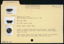 | Description: | About one-third of rim and wall missing. Open bowl on heavy torus ring foot; light groove around upper edge of foot. Good black glaze; foot and space inside it reserved, with broad and narrow glaze circles and dot. | |