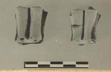 | Description: | Reserved on top and somewhat smaller than the pair attached to P 1324. The pot wall is thinner than that of P 1324 and shows part of a reserved zone which starts before their upper edge (upper edge determined by glaze drips into the holes and the concave side of the wheel marks). The almost flat wall suggests a lid, but the wheel marks indicate one too large for P 1324; the flatness is probably due to pressure on pot wall while attaching lugs. | |