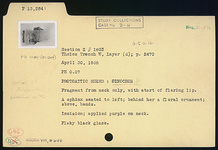 Description:   Fragment from neck only with start of flaring lip. A sphinx seated to left; behind her a floral ornament; above, bands. Incision; applied purple on neck.