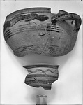 Description:   Two large compound fragments from wall preserve a part of the lip. Steep wall, slightly out-turned rim. The wall is decorated inside and out with broad bands of brown glaze. Between the uppermost bands outside, a wavy line.