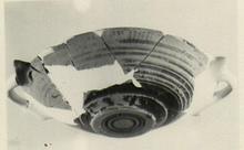 | Description: | Most of handles and parts of wall are missing; restored in plaster. Shallow bowl with very low foot, flat on underside, with horizontal spurred handles at rim. The wall inside and out, and the underside of the base are decorated with concentric bands. On the lip and around the top of the wall are groups of short bars. Thin brown glaze. | |