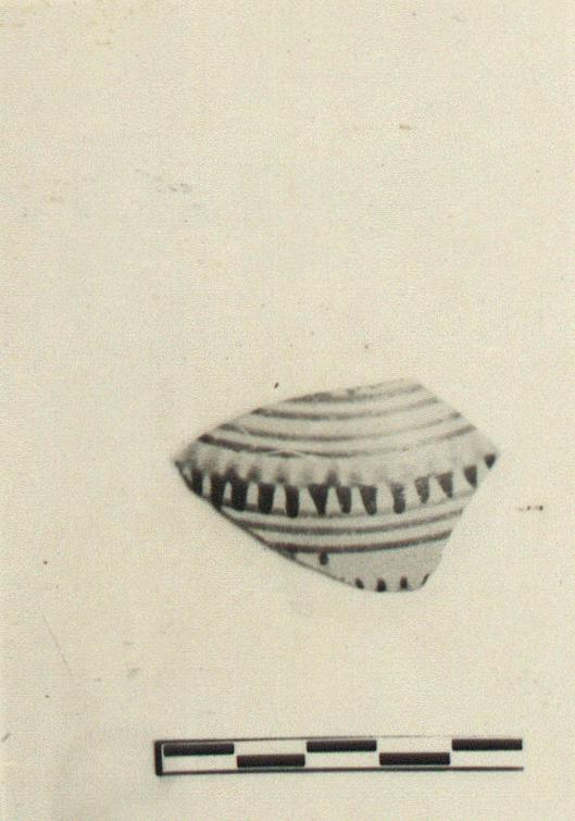 | Description: | Fragment from the wall. On the outside are zigzag lines separated by straight lines; on the inside, part of a large bird to right with zigzag and chevron fillers. Reddish glaze. | |