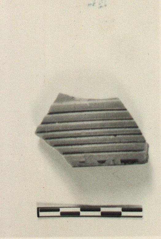 | Description: | Fragment from rim with a trace of the attachment of the crossbar. Seven horizontal ridges around top of wall. Black glaze on inside, on rim and on a narrow line around top of outer wall. | |