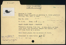 Description:   Fragments missing from rim. A deep plate on high ring foot; rim thickened toward the inside, set off from floor by a groove.