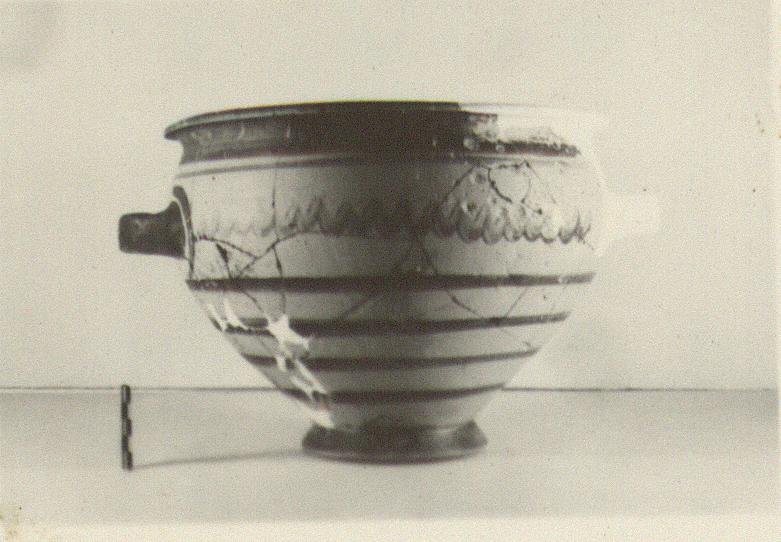 | Description: | Fragments missing from wall and rim, and one handle. Restored in plaster. Small high ring foot; steeply flaring sides rounded above; narrow outcurved lip; band handles at point of greatest circumference. Outside of foot and handles glazed and the lip, inside and out; on the wall, inside and out, glaze bands, widely spaced, with a wavy band in the handle zone. Curving lines around handle attachments. Pinkish clay; firm brown glaze. | |