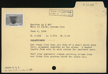 Description:   Low rough flat base and body of a small plain deep bowl, squeezed together at the sides. A basket handle from side to side across the narrower part.