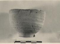 | Description: | Low rough flat base and body of a small plain deep bowl, squeezed together at the sides. A basket handle from side to side across the narrower part. Buff clay unglazed; coarse grooving around body and three fine grooves below the plain lip. | |