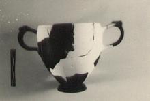 | Description: | Much missing; restored in plaster. Moulded base and deep egg-shaped body with plain rim. Band handles with leaf thumb-rests. A scraped groove below the handle zone and one around the foot; a plain groove below the lip. Decoration of beribboned torches and dot clusters in thinned clay-paint and white. Rather dull black glaze. | |