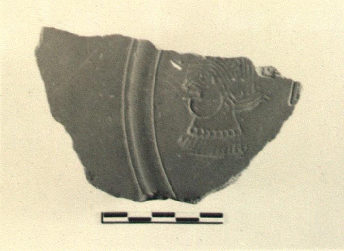 | Description: | From the center of a large plate with low ring foot. Within two concentric circles, a female head, left, wearing a diadem and a necklace; at the right, the start of a cross(?). African Red Slip Ware. | |