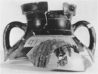 | Description: | Lip, neck and shoulder preserved; the shoulder fragmentary. Small bauch-amphora with heavy collared lip, slightly flaring; handles round in section, from lower part of neck to shoulder. Panel front and back; each bordered by a single purple line at top and sides. In each, a horse protome, right. Purple for horses' manes, eyes and nostrils; well preserved on A, worn on B. Two purple bands around neck and two around lip outside. Broader band just below lip inside. Behind the head on A, a curious filling ornament (letters?). Black glaze, somewhat worn. | |