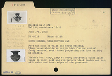 | Description: | Foot and much of walls and mouth missing. Restored in plaster. Plump broad-shouldered pot. Vertical neck; broad projecting rim flat on top; no handles. Horizontal black glaze bands on body; neck and rim largely black inside and out, with outer and inner edges of rim preserved. Pinkish-buff clay, gray at core. | |