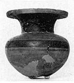 | Description: | Foot and much of walls and mouth missing. Restored in plaster. Plump broad-shouldered pot. Vertical neck; broad projecting rim flat on top; no handles. Horizontal black glaze bands on body; neck and rim largely black inside and out, with outer and inner edges of rim preserved. Pinkish-buff clay, gray at core. | |