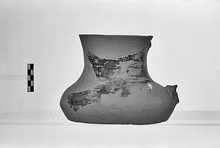 | Description: | Four fragments, much mended, preserve part of neck and shoulder, with one upper and one lower handle attachment. On the shoulder, checkerboards and diminishing squares in terracotta paint and white; mask at handle attachment. On the neck, incised lines and spirals, with rosettes and a wavy line in white, and clusters in terracotta paint. Glaze red to black, much worn. | |