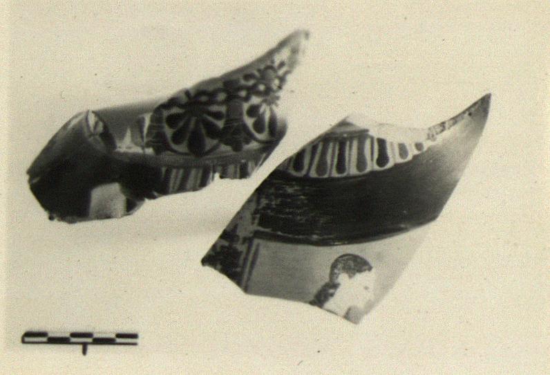 | Description: | Seven fragments make up to two. a) Preserves some of the upper part of the body. Above, tongues alternately red and black; below, the upper left corner of a reserved panel with a head of a woman to right; white for her face and neck, red for the pupil of her eye. b) (six joining fragments) Preserves part of the tongue pattern, front and back, and some of the neck above with a double lotus and palmette chain; red for the hearts of lotuses and palmette. | |