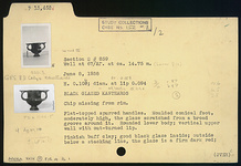 Description:   Chip missing from rim. Flat-topped spurred handles; moulded conical foot, moderately high, the glaze scratched from a broad goove around it; rounded lower body; vertical upper wall with out-turned lip.