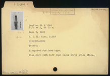 | Description: | Intact. Elongated fusiform type. Three white lines. Clay gray with buff clay wash. | |