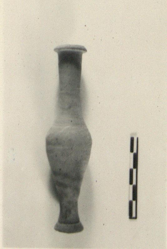 | Description: | Intact. Elongated fusiform type. Three white lines. Clay gray with buff clay wash. | |