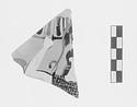 | Description: | Broken all around; shoulder fragment. Athena: the back of her head, her right shoulder and raised right arm preserved. At left of fragment the head of a horse(?) with red mane. Red also for Athena's earring, for the outer edge of the crest of her helmet, for alternate tongues and for a line above the tongue pattern, which borders the scene at the top. White for Athena's flesh. | |
