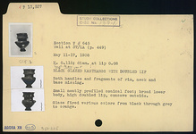 | Description: | Both handles and fragments of rim, neck and base missing. Small neatly profiled conical foot; broad lower body; high doubled lip, concave outside. Glaze fired various colors from black through gray to orange. | |