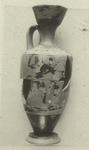 Description:   Mended from seven pieces. Mouth and handle complete but base chipped in the back, and considerable portions of the body missing including parts of the figured scene. The scene depicts Dionysos standing, facing right, toward a maenad. Surrounding satyrs dance right looking back. Glaze is badly flaked except for a patch including most of the maenad. Preserved are the white of her flesh with incised drawing of her features, her red fillet with incised border, her dress (chiton and himation hanging in folds from her raised left arm) with red collar and red and white dot ornaments. Red also for the beard of the left satyr and for a pair of lines around the glaze below the scene. Incision for interior details. On the shoulder of the vase, lotus-bud border around a collar of small strokes; the mouth was glazed inside and out, reserved on top. The base unglazed beneath and on the concave outer part.