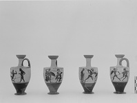 Description:   Mended from four fragments; another small bit from the shoulder does not join; the neck broken off at the point of attachment. Pieces missing from the shoulder and a large fragment from the side which included the head of the youth and the middle part of the body of the warrior to the left. The scene depicts two warriors charging and two youths looking on. Incision for interior details, including the plumes of the high crested helmets. Added red for bands around the helmets and for bands and dots on the shields and corselets and for the baldricks. On the shoulder of the vase, a row of short strokes around the base of the neck; outside, ivy pattern, interlaced.