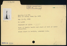 | Description: | Part of double handle and start of bowl of ladle (kyathos) preserved. Glaze black to reddish, somewhat worn. | |