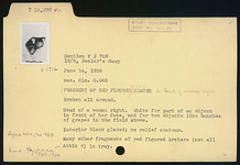 | Description: | Broken all around. Head of a woman right. White for part of an object in front of her face and for two objects like bunches of grapes in the field above. Interior black glazed. No relief contour. Many other fragments of red figure kraters (not all Attic?) in tray. | |