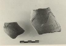 Description:   Non-contiguous shoulder and neck fragments. Around the neck, double dotted line; below, a dotted zigzag; under it a crosshatched zone and below that, again dotted zigzags.