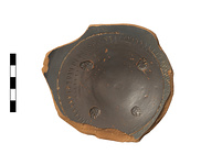 | Description: | A single fragment preserves the high ring foot and the center of the floor. Within a rouletted circle, four scattered palmettes. Stacking marks prominent. Dull black glaze over all, except for scraped groove at junction of foot and floor and resting surface of foot, reserved. | |