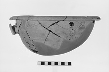 | Description: | Fragment from wall and rim only; strengthened with plaster. About half the circumference of the rim preserved, not perfectly circular, as if warped in making. Deep rounded bowl with broad out-curved rim and a semicircular lug handle, also with a curved rim, set on the wall slightly below the rim. Black glaze, largely peeled, over all. | |